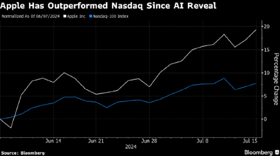 苹果在6月的全球开发者大会上推出了其人工智能服务套件,发布后苹果股价一度创下年内首个纪录高位。