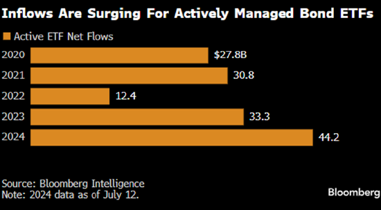 汇编数据显示,截至7月12日,净流入主动型固定收益ETF的资金为440亿美元,比去年全年高出约三分之一,是2022年的三倍之多。