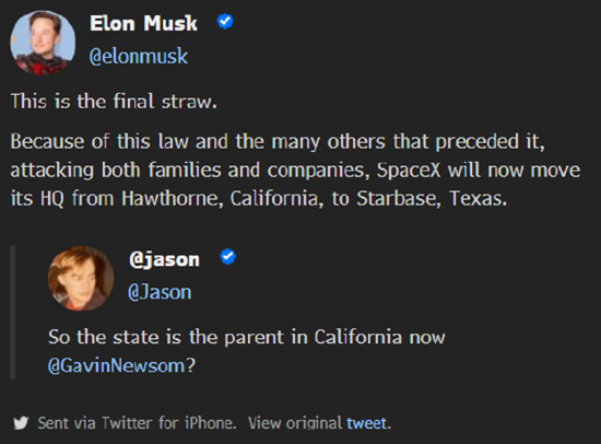 埃隆·马斯克表示X和SpaceX的总部都将迁往德州,这位亿万富翁的理由是对这两家公司目前所在的加州的法律感到不满。
