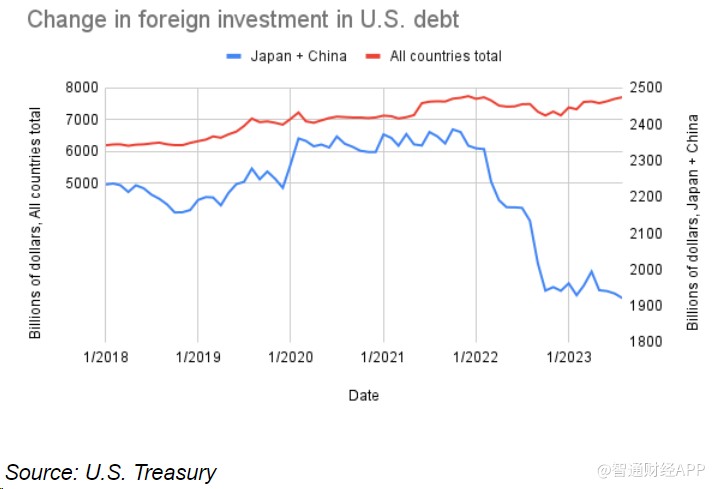 外国投资者持有的美国国债比例仍然很高,截至2023年第二季度约为30%,这在很大程度上要归功于美国国债的避风港地位。富国银行策略师Jennifer Timmerman和Gary Schlossberg表示,尽管中国和日本的美国国债持有量一直在下降,但近期美国国债持有量一直相对强劲。但情况并非总是如此。他们在最近的一份报告中写道:“疲软的财政政策和疲弱的经济表现抑制了对美元和美国国债的需求,海外对美国国债的投资一直比国内投资更不稳定,部分原因是存在更具吸引力的全球替代品。”