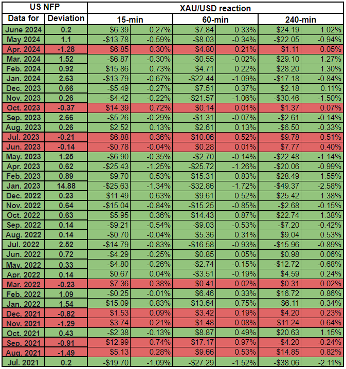 我们绘制了非农数据发布后的15分钟、1小时和4小时内的黄金价格反应。然后,我们将黄金价格的反应与实际非农结果与预期结果之间的偏差进行比较。