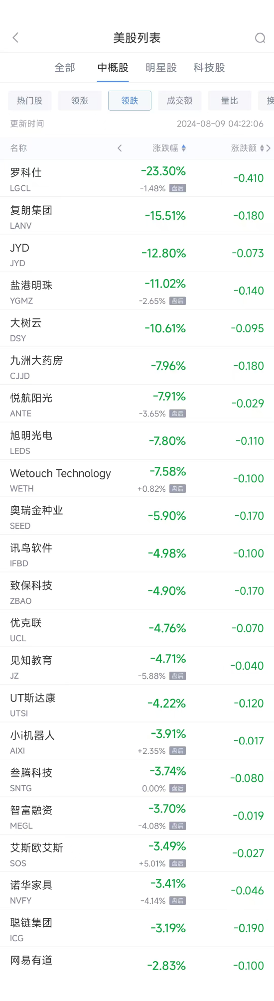 领跌中概股列表: