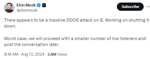 “X似乎遭受了大规模的DDOS攻击。正在努力将其关闭,”马斯克在该社交媒体网站上的一篇贴文中说道,此时超过活动预定开始时间大约18分钟。“最坏的情况是,活动继续进行,但将减少实时听众的数量,并稍后发布该对话。”