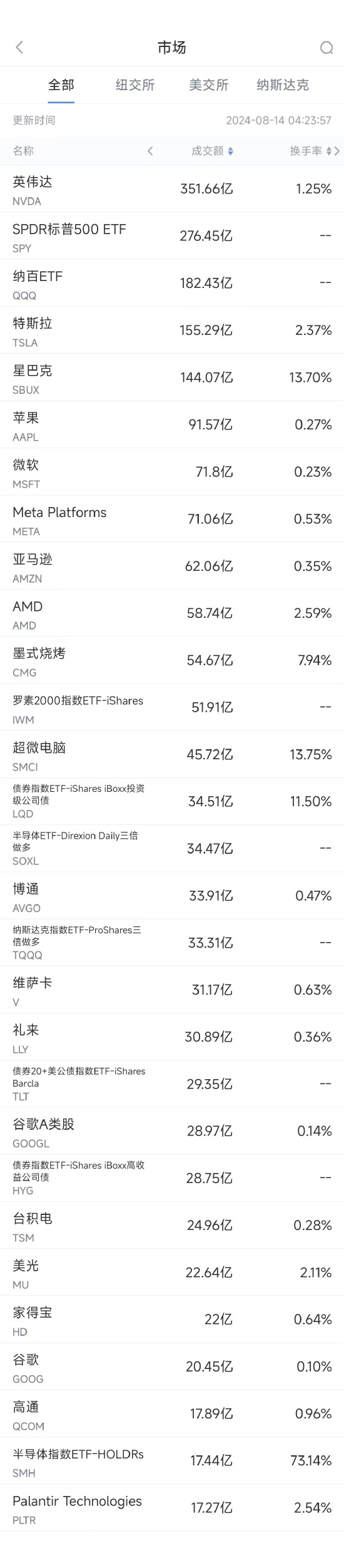 【XM最新官网】8月13日美股成交额前20:星巴克换帅,股价大涨24.5%