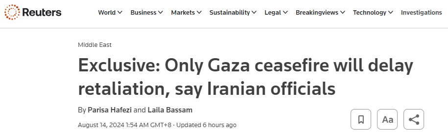 路透社周三发布独家报道称,三名伊朗高级官员表示,只有在本周有望举行的会谈中达成加沙停火协议,才能阻止伊朗对以色列在其领土上暗杀哈马斯领导人哈尼亚(Ismail Haniyeh)的事件进行直接报复。