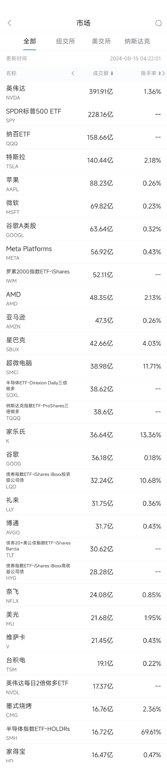 周三美股成交额第1名英伟达收高1.61%,成交391.91亿美元。对比上周三(8月7日)的收盘价,英伟达股价在此后五个交易日累计上涨了19.3%。