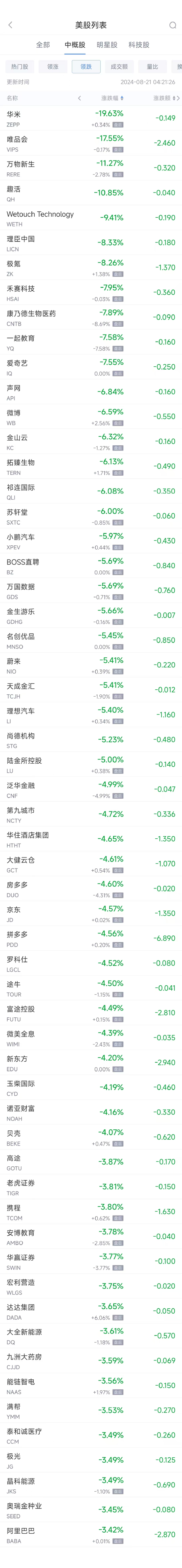 领跌中概股列表: