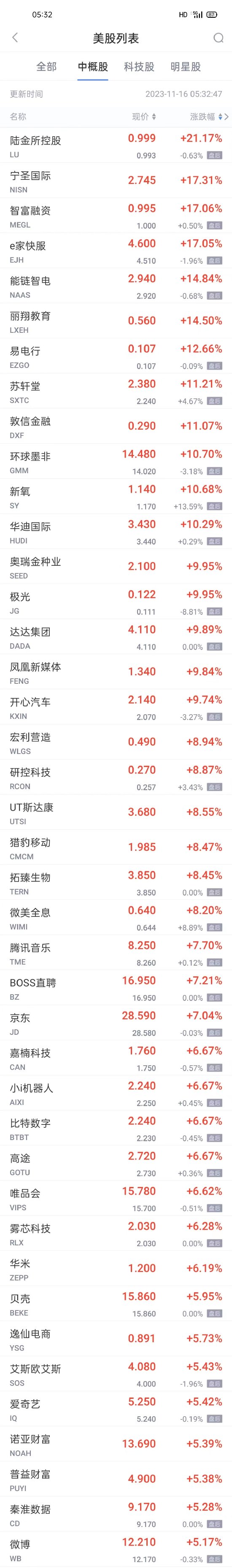 陆金所控股涨超21%,能链智电涨超14%,新氧涨超13%,达达集团、环球墨非涨超9%,拓臻生物涨超8%,腾讯音乐、高途、BOSS直聘、京东涨超7%,唯品会、比特数字、嘉楠科技、雾芯科技、贝壳涨超6%,爱奇艺、诺亚财富、秦淮数据、微博涨超5%,小i机器人、蔚来、万国数据、逸仙电商、虎牙涨超4%,360数科、阿里巴巴、途牛、涂鸦智能、中阳金融、百度、拼多多、亚朵集团涨超3%,怪兽充电、挚文集团、网易有道、哔哩哔哩、乐信、大健云仓、金山云、名创优品、富途控股、小鹏汽车涨超2%,斗鱼、联想汽车、迅雷、大全新能源、老虎证券、欢聚集团、亿航、满帮、汽车之家、携程涨超1%,叮咚买菜涨近1%。