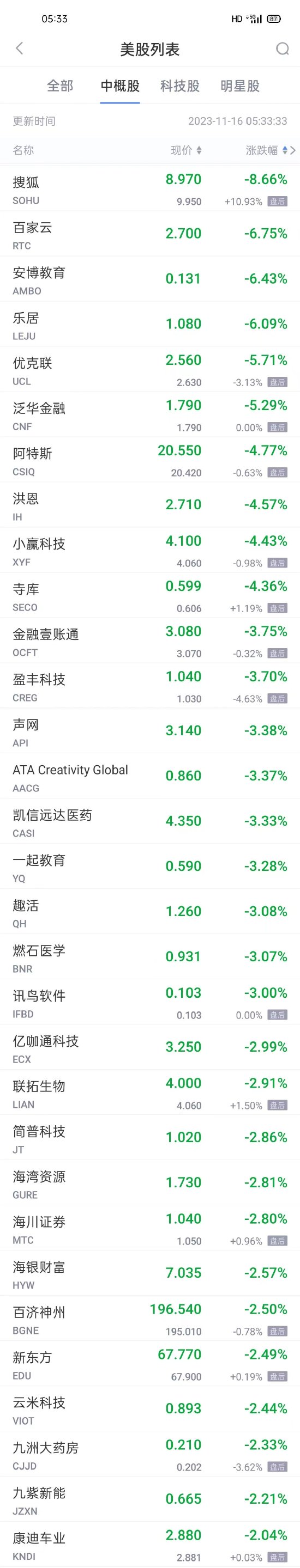 领跌中概股列表: