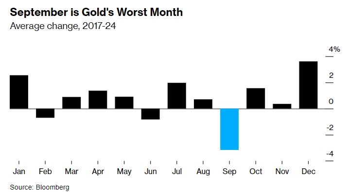 这种动态远不可靠——在30年的时间跨度内,金价在9月份实际上是上涨的——但对近期金价走软的一个解释是,交易员在动荡的夏季采取防御性立场,并买入黄金,然后在9月份出售。