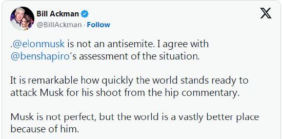 不过,身为犹太裔亿万富翁,并且在巴以冲突爆发后一直带头打压反以声音的阿克曼这次却挺身而出,为马斯克进行了辩护。