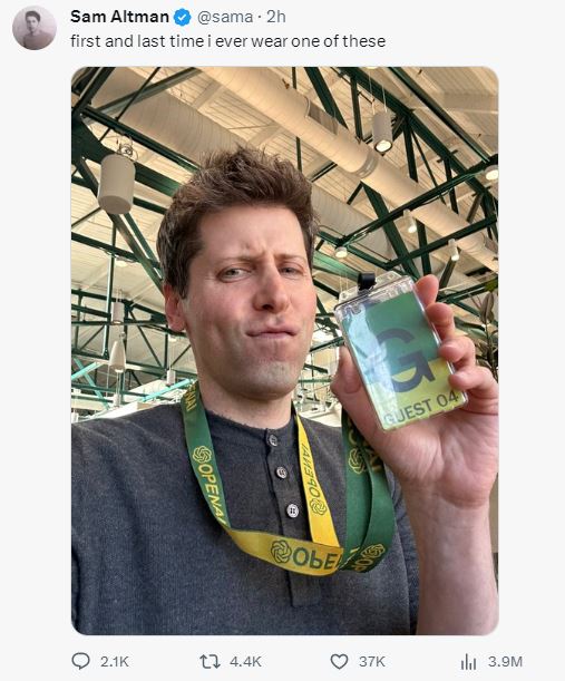 周日,奥特曼在社交平台X上发布了一张自己戴着OpenAI访客卡的照片,并配文:“这是我第一次也是最后一次戴这个。”