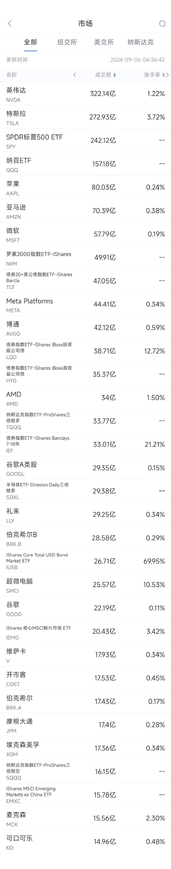 第3名苹果收高0.69%,成交80.03亿美元。美国银行表示,苹果即将举行的iPhone发布会可能会成为该股的积极催化因素,股价反应将与该股历史上的典型表现背道而驰。分析师Wamsi Mohan写道,“在过往的发布会中,苹果股价会在活动结束后回落,在活动后的30-60天才会反弹,”但“如果苹果展示的Apple Intelligence或第三方集成功能令人信服,或者苹果上调价格,那么股价表现可能会好于过去的事件”。