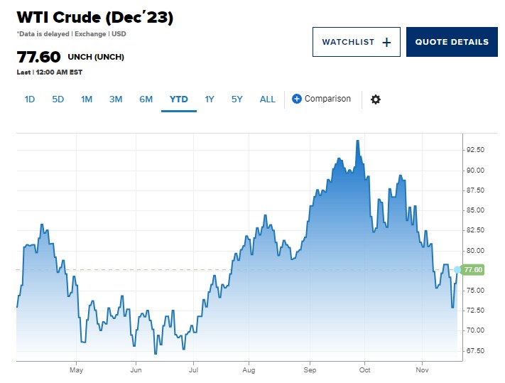 美国原油WTI原油上周一度跌入熊市,较9月收盘高点下跌22%。美国原油期货周一上涨至每桶78.02美元,较前一交易日上涨2.13美元,涨幅2.81%,因市场预期欧佩克可能再次减产。