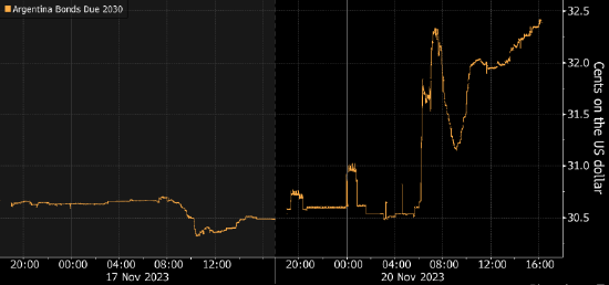 米莱在竞选活动中承诺对他所说几十年来被误导的政府政策进行彻底修正。他承诺削减公共支出,并关闭央行,以抑制通胀和增强财政账户,对已经预计另一场违约即将到来的债券投资者来说,这些政策可能是个福音。