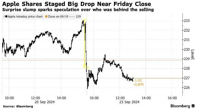 上周五, $苹果 (AAPL.US)$本应成为主要股指季度调整的大赢家,指数基金再平衡潮料利好股价,实际上,当日大部分时间里确实如此,但在收盘前10分钟左右却发生巨变。苹果迅速从盘中高点下跌逾2%,收于亏损,出人意料的逆转让市场观察人士纷纷猜测是何原因触发了变动。