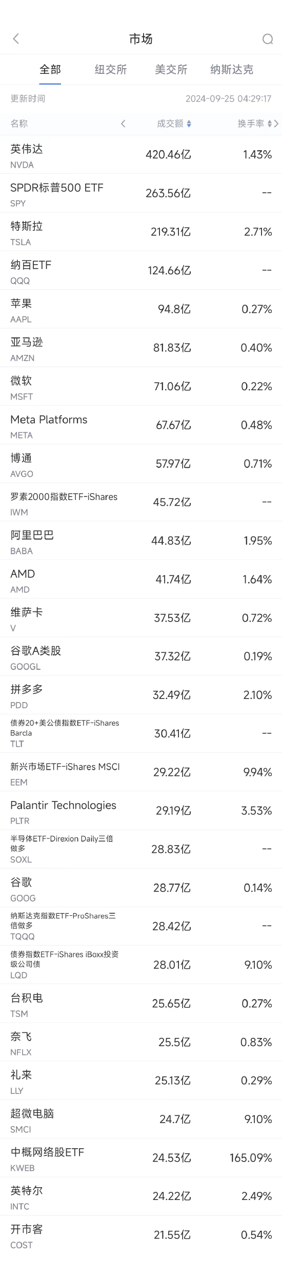 【XM最新官网】9月24日美股成交额前20:阿里大涨7.9%,央行刺激政策推动中概股普涨