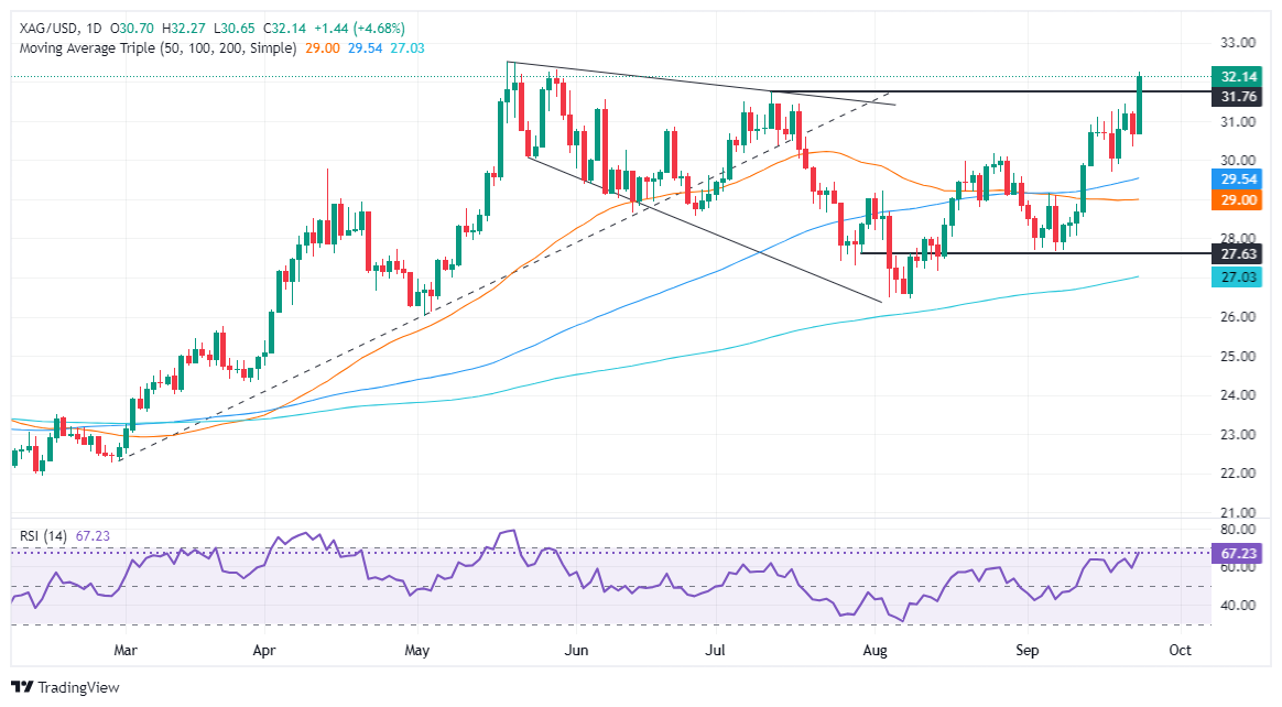 周二(9月24日),受美元走软推动,现货白银暴涨逾4%,并一度站上32.00美元/盎司关口。FXStreet分析师Christian Borjon Valencia最新撰文,对银价技术走势进行分析。