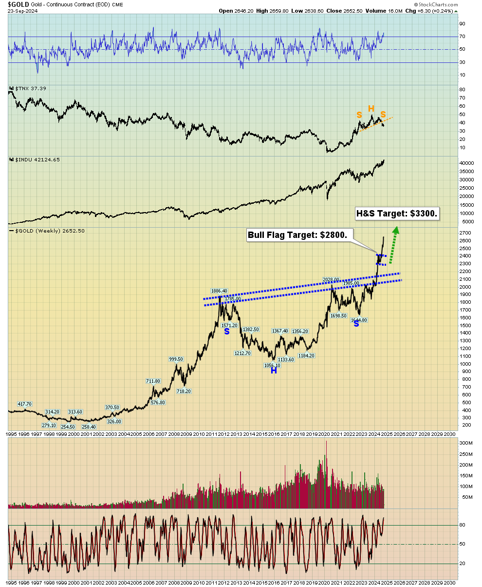 Stewart谈起黄金价格,他表示:“上周收盘图上的牛市旗形和反向H&S走势表明,金价可能升至2800美元、3000美元,甚至高达3300美元,然后才会出现重大回调。”