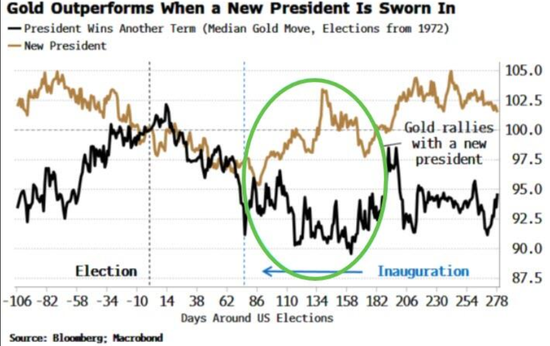 新总统赢得大选时,黄金平均表现较好,但仅限于他们宣誓就职之后。