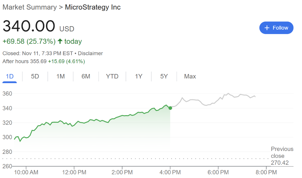 周一,MicroStrategy股价上涨近26%,报340美元/股,创下历史新高——周一早些时候,MicroStrategy披露公司从10月31日至11月10日通过发行新股筹集了约20亿美元,新购买了27.2万枚比特币,这使得MicroStrategy进一步巩固了其作为全球最大公司比特币持有者的地位,持币数量达到27.942万枚。