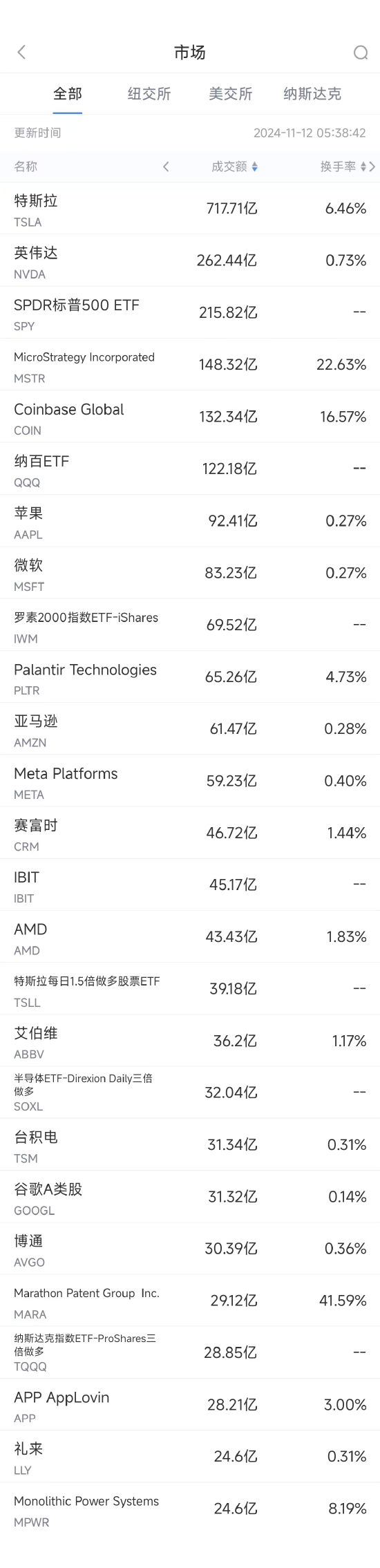 【XM最新官网】11月11日美股成交额前20:比特币大涨10%,加密货币板块普涨