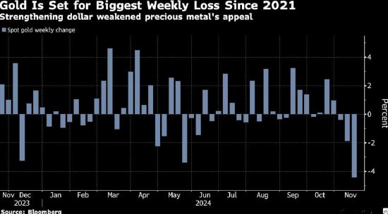 金价已从10月31日的历史高点下跌了约8%,在特朗普上周赢得白宫大选后,跌势进一步加剧。而美元则升至两年来的高点,原因是人们预期,在特朗普担任总统期间,经济增长和企业利润将会走高。美元走强使得以美元计价的大宗商品对大多数买家来说更加昂贵。