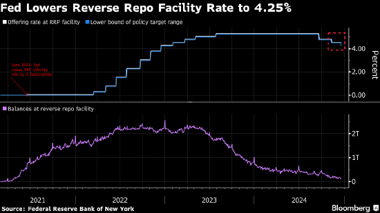 根据周三的政策声明,官员们将隔夜逆回购(RRP)协议工具利率相较于目标区间下限的水平下调了5个基点。鉴于美联储将联邦基金利率下调至4.25%-4.50%的目标区间,新的RRP利率为4.25%,自2021年以来首次与目标区间下限相符。