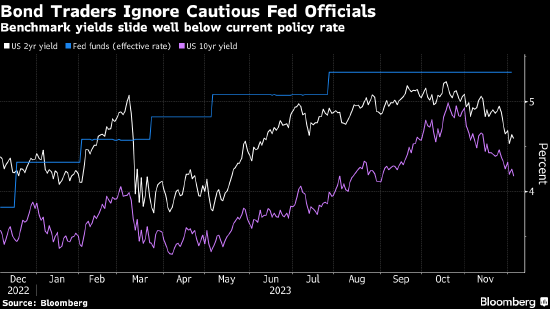过去一个月疲软的通胀和就业数据使投资者相信美联储已完成加息,并点燃了未来12个月至少降息1.25个百分点的大胆押注。10月时还在5%高位的美债收益率大幅回落,10年期基准收益率下滑了逾75个基点。