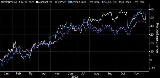 Alphabet股价上涨5.3%,创下7月份以来最大单日涨幅,市值增加逾870亿美元。该股2023年已上涨55%,相比之下纳斯达克100指数上涨46%,微软上涨55%。微软对OpenAI的投资,被视为是Alphabet在人工智能领域的主要竞争对手。