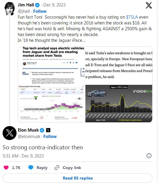 作为回应,马斯克在霍尔的帖子下评论说:“多么厉害的反向指标。”