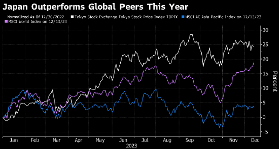 日本股市今年势将迎来举世瞩目的涨势,因为这个全球第三大经济体显示出果断遏制持续数十年通缩的迹象,而且沃伦·巴菲特的认可也为日本股市吸引了全球投资者。资金从中国流向日本,到2024这种趋势不太可能减弱,JPMorgan Securities Japan Co.衍生品策略师Masanari Takada称。
