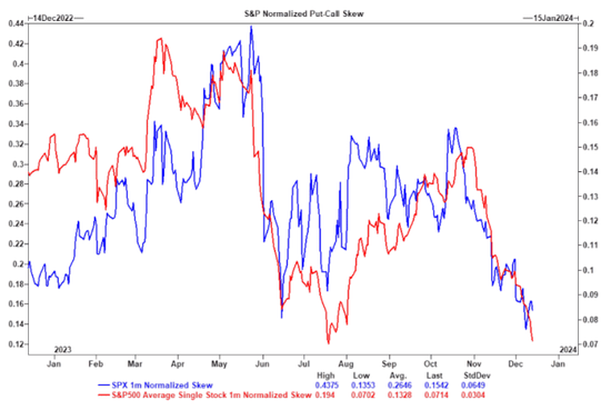 标普500指数用来衡量看跌期权相对于看涨期权成本的skew指标位于低位