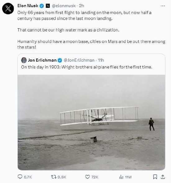 他写道:“从第一次飞行到登陆月球只有66年,但距离上一次登月已经过去了半个世纪。这不能成为我们文明的最高标志。人类应该在月球上建立基地,在火星上建立城市,成为星际文明!”
