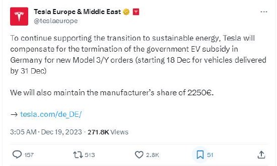 特斯拉周一通过其在X平台上的官方账号回应称,将推出自己的激励计划。“为了继续支持向可持续能源的过渡,特斯拉将补偿德国政府对新Model 3/Y订单的电动汽车补贴的终止(从12月18日开始,12月31日前交付的车辆)。我们还将保持制造商2250欧元的补贴份额。”
