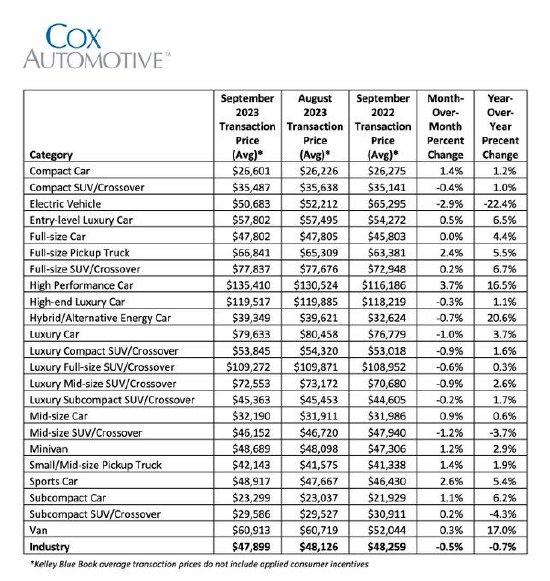 伍德周六转发了Ark自动驾驶技术与机器人研究主管萨姆-科鲁斯的一篇帖子(Sam Korus),他在帖子中分享了考克斯汽车公司发布的9月份美国各类汽车价格的图表。
