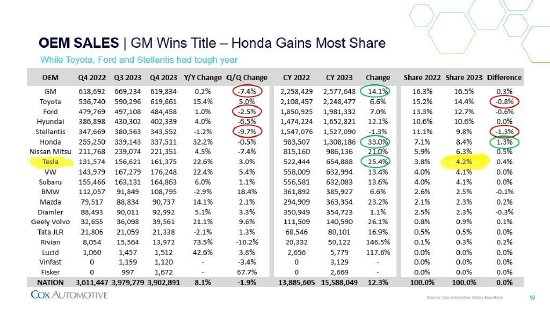 据考克斯汽车公司旗下研究机构凯利蓝皮书的最新数据,2023年特斯拉在美国交付了654888辆汽车,同比增长25.4%,其市场份额升至4.20%,在所有车企中位居第八,有史以来首次超过大众,后者去年的美国市场份额为4.1%。