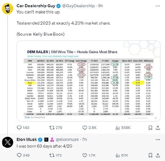 众所周知,“420”和“69”是马斯克非常喜爱的两个数字。一位X用户分享了凯利蓝皮书的这张图表,指出了这一巧合:“特斯拉2023年的市场份额恰好是4.20%。”