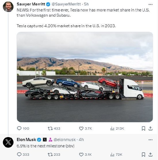 电动汽车分析师索耶·梅瑞特(Sawyer Merritt)也分享了这一消息,指出这是特斯拉的美国市占率首次超过大众和斯巴鲁。