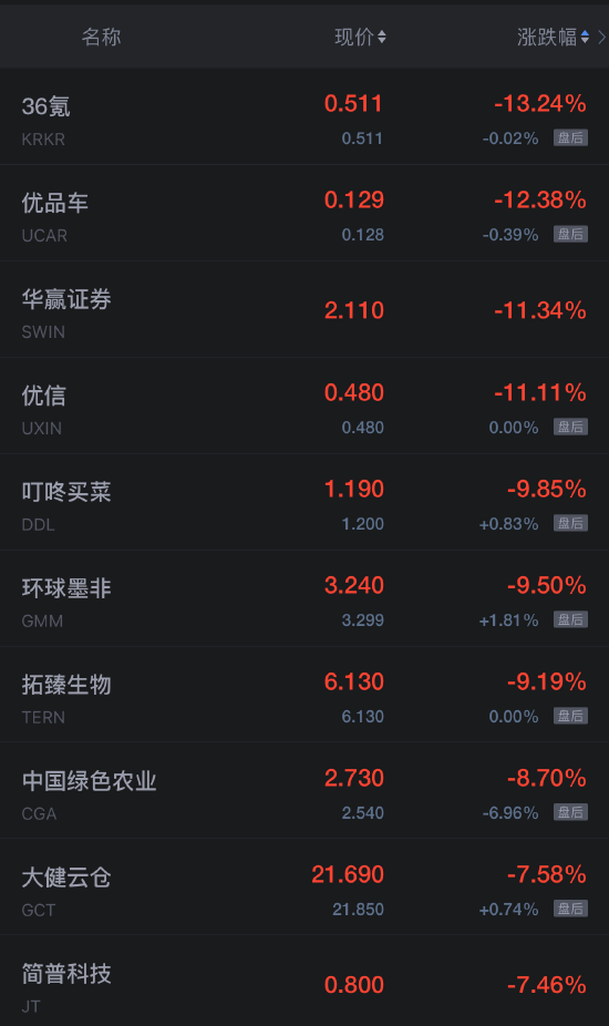 36氛跌超13%,优品车,华赢证券,优信等跌超11%,叮咚买菜,环球墨非,拓臻生物等跌超9%,中国绿色农业,大健云仓,简普科技等跌超7%。