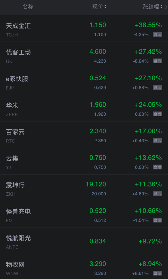 天成金汇涨超38%,优客工场,e家快服,华米等涨超20%,百家云,云集,震坤行,怪兽充电等涨超10%,悦航阳光,物农网等涨超8%。