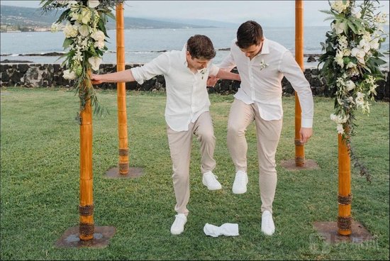 另一张照片中,这对新人一起踩碎玻璃杯,这是犹太婚礼的传统习俗。
