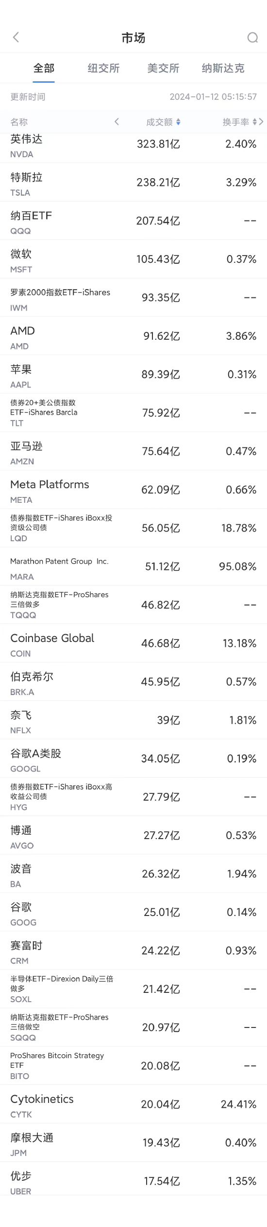 第8名Marathon Patent收跌12.6%,成交51.12亿美元。美国比特币现货ETF上市首日交易量达到46亿美元,与此同时,周四美股加密货币概念股普遍走低。第9名Coinbase Global收跌6.7%,成交46.68亿美元。