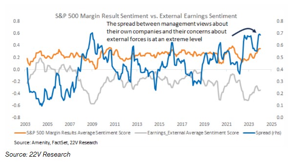 企业高管对地缘政治和政治等因素的预期正在恶化,不过他们对企业基本面的看法不断改善。22V Research汇编的计算显示,后者改善现在超过前者恶化的幅度是至少20年来最大的。