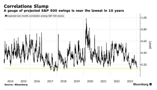 这在一定程度上解释了标普500指数个股一个月预期相关性指标跌至0.14左右的原因。汇编数据显示,在过去10年里,这种水平只出现过几次。读数为1表示所有股票走势同步。