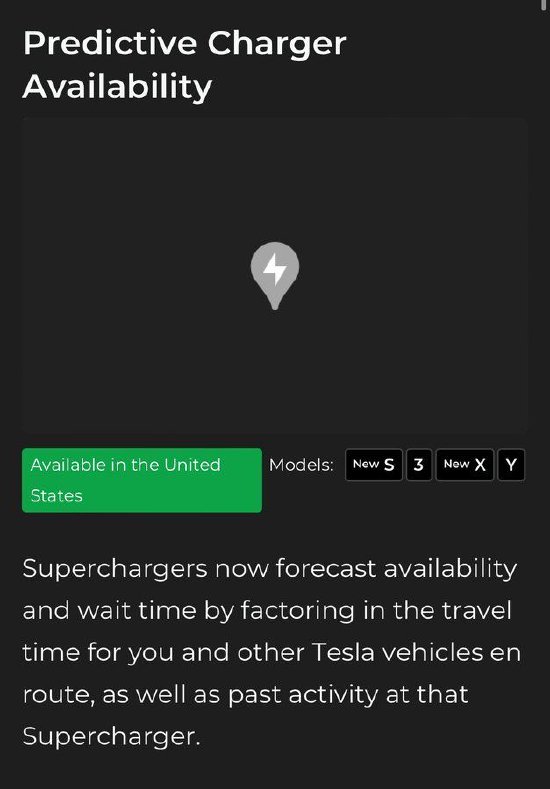 特斯拉公司为其在美国的超级充电站网络推出了一项名为“预测充电桩可用性”的新功能,以帮助那些需要充电的车主更准确地预测他们准备前往的超充站的可用充电桩数量。