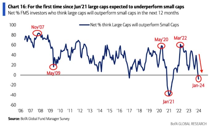 这项于1月5日至11日进行的调查显示,投资者预计未来12个月大盘股的表现将逊于小盘股,这是自2021年6月以来的首次。