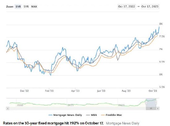 根据美国《抵押贷款新闻日报》(Mortgage News Daily)的指数,30年期固定抵押贷款的平均利率周二触及7.92%,创23年新高,目前30年期抵押贷款的月平均还款额徘徊在每月1820美元左右。