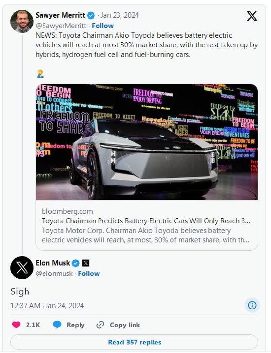 【XM最新官网】丰田章男称电动汽车市占率最多30%,马斯克回应