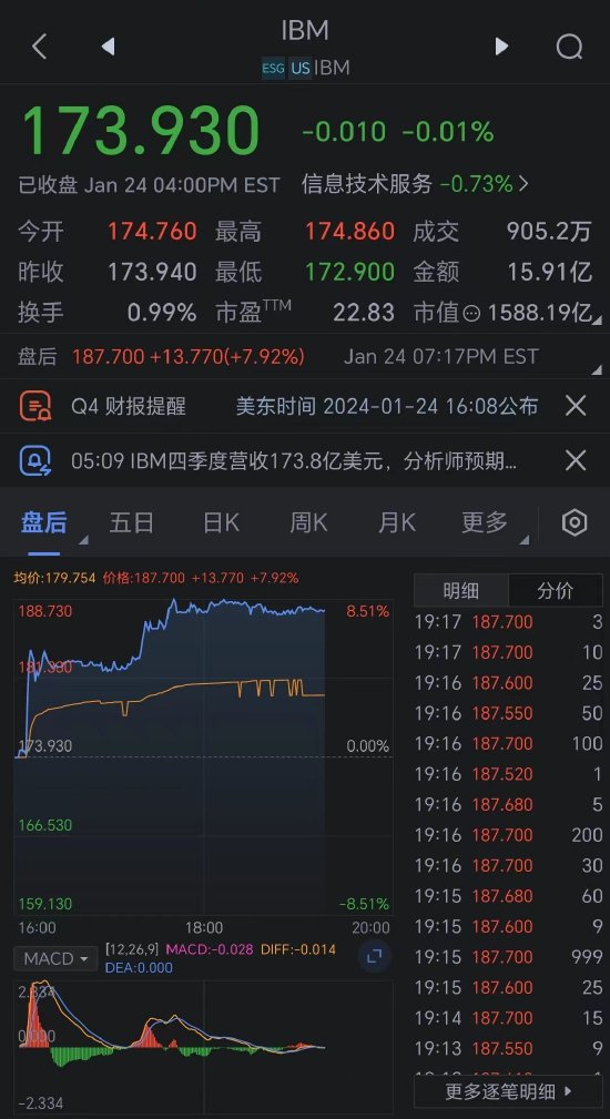 IBM股价在盘后交易中飙升约8%,周三收报173.93美元,在过去12个月里上涨了23%。